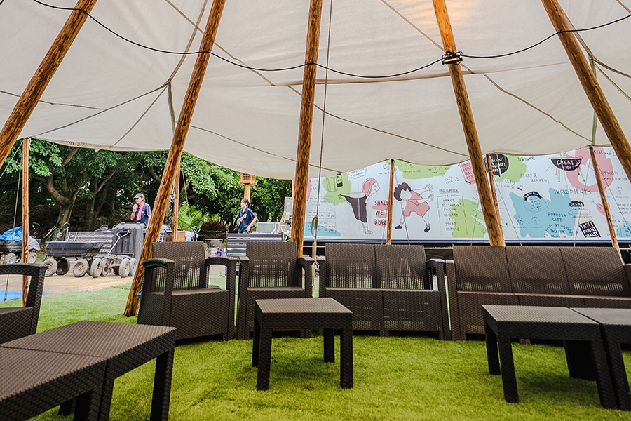 アメリカ先住民の移動式住居「ティピー」をモチーフにしたテントです。キャンプやインテリアでも有名ですが、舞鶴BBQのティピーサイトは大きさが段違い。全4卓をあわせて、最大20名様までご一緒にご利用いただける大型テントです。